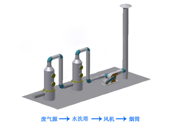 酸堿廢氣由風機導入吸收塔,塔體上部噴淋堿性或酸性吸收液,下部進入塔體的有害氣體與噴淋液呈逆流流動,經過不等速迂回式的噴霧處理,廢氣穿過有填料組成的填料層,使氣液兩相充分接觸發生吸收反應,達到凈化之目的;凈化后的氣體達到排放標準,由排放煙囪排入大氣。