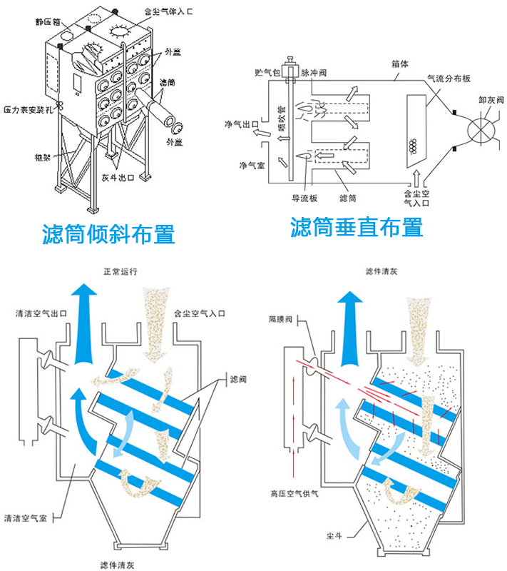 濾筒除塵器的結(jié)構(gòu)是由進(jìn)風(fēng)管、排風(fēng)管、箱體、灰斗、清灰裝置、導(dǎo)流裝置、氣流分流分布板、濾筒及電控裝置組成。含塵氣體進(jìn)入除塵器灰斗后,由于氣流斷面突然擴大及氣流分布板作用,氣流中一部分粗大顆粒在動和慣性力作用下沉降在灰斗;粒度細(xì)、密度小的塵粒進(jìn)入濾塵室后,通過布朗擴散和篩濾等組合效應(yīng),使粉塵沉積在濾料表面上,凈化后的氣體進(jìn)入凈氣室由排氣管經(jīng)風(fēng)機排出。