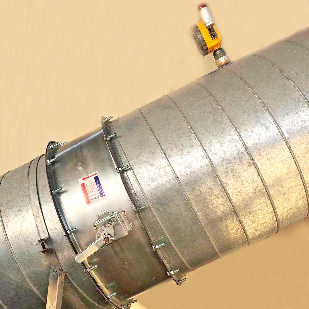 抑爆裝置:在風管和(或)除塵器上設置抑爆裝置,爆炸發生瞬間,向風管和(或)除塵器內充入用于撲滅火焰的物理、化學滅火介質,抑制爆炸發展或傳播。存在有毒性、腐蝕性粉塵,以及燃料粉塵的除塵器及風管不應采用泄爆裝置進行泄壓,應選用向除塵器及風管充入用于撲滅火焰氣體或粉塵介質的抑爆裝置。