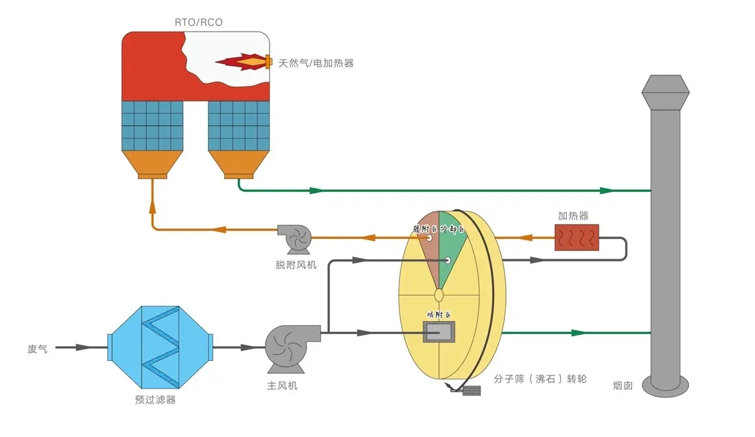 CO是有機(jī)廢氣源通過引風(fēng)機(jī)作用送入凈化裝置換熱器換熱,再送入加熱室,通過電加熱裝置,使氣體達(dá)到催化反應(yīng)溫度,并在催化室內(nèi)催化劑的作用下,分解成CO2和H2O。有機(jī)廢氣分解的過程為放熱反應(yīng),反應(yīng)后的氣體再進(jìn)入換熱器與低溫氣體進(jìn)行熱交換,使進(jìn)入的氣體升溫預(yù)熱。加熱系統(tǒng)僅需通過自控系統(tǒng)實現(xiàn)補償加熱,即可完全燃燒,節(jié)省能源,且廢氣有效去除率達(dá)到95%以上RCO和CO燃燒方式相同,換熱方式與RTO相同,投資堪比RTO且處理廢氣種類受催化劑影響,種類少于RTO。
