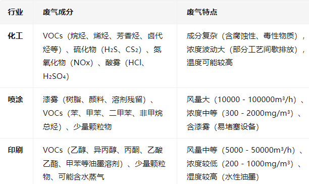化工、噴涂、印刷行業的廢氣成分、風量、濃度差異顯著,需針對性處理:
