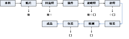 本項目主要產品為移動手機、振動馬達,生產工藝基本一致。①在PCB板上需貼片的位置刷錫膏;②通過貼片機在對應位置上貼芯片;③通過回流焊進行焊接,使芯片固定在PCB板上;④通過插件機進行插件;⑤通過波峰焊進行焊接,使插件固定在PCB板上,⑥使用電烙鐵將PCB板與各電子配件進行線路連接,⑨手工組裝外殼;⑩最后經老化測試合格后,即為成品。
