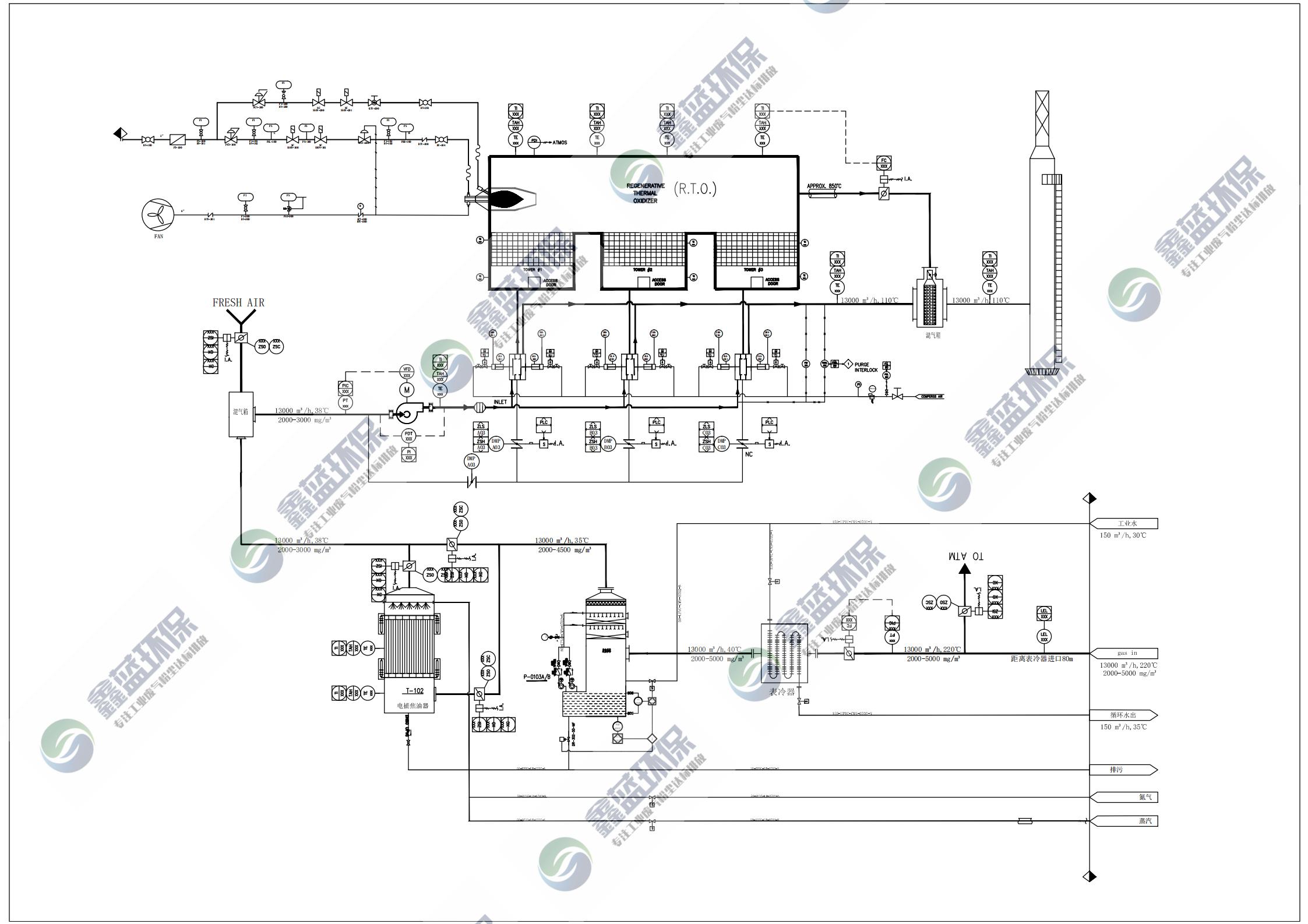 瀝青煙氣經(jīng)過表冷器降溫至40-50℃后,再經(jīng)過旋流板塔洗滌掉廢氣中的顆粒物及瀝青煙氣,再進入焦油捕捉器進一步捕捉瀝青煙氣及部分焦油,最后氣態(tài)的VOCs進入RTO高溫燃燒,此時廢氣已經(jīng)達標,然后經(jīng)煙囪排入大氣。