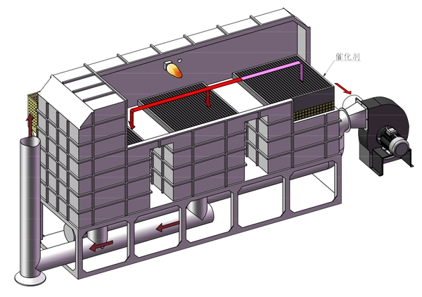 RCO的工作原理是:有機廢氣經(jīng)過預處理后進入RCO設備,在催化組件的作用下,有機廢氣在較低的溫度下(通常為250℃~400℃)被氧化成無害的水和二氧化碳等物質(zhì)。在此過程中,催化劑起到降低反應活化能的作用,使得有機廢氣能夠在較低的溫度下發(fā)生氧化反應。此外,RCO設備中的蓄熱體能夠有效地儲存和釋放熱量,從而實現(xiàn)熱能的回收利用,降低設備的運行成本。