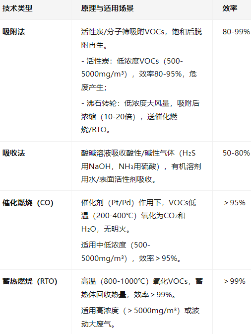 根據廢氣濃度、成分選擇技術,核心目標為降解/去除VOCs、惡臭: