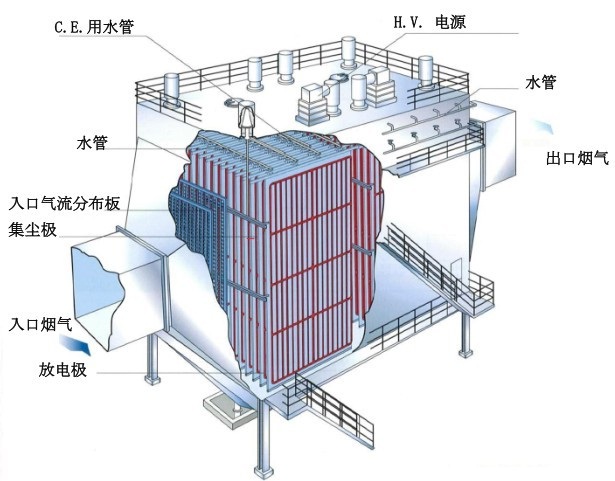 濕式靜電除塵器主要由進出口煙道、除塵器殼體、導流板、整流格柵、陽收塵板陰線、絕緣箱、沖洗水系統、電源及控制系統組成。