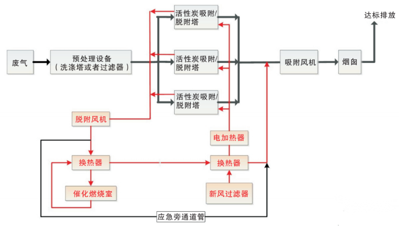 由離心風機將大風量、低濃度有機廢氣吸入活性炭吸附床,在吸附床內與多層蜂窩狀活性炭充分凈化(吸附),活性炭內部逐漸富集濃縮大量有機廢物,而潔凈的氣體則排入大氣;通過燃燒裝置產生的高溫氣體經換熱之后通入活性炭吸附床,使內部有機廢物90℃高溫氣化從活性炭孔隙中逸散而出,此時的廢氣濃度遠遠高于初始吸附的廢氣濃度,然后進入催化燃燒裝置(350℃)進行氧化分解成CO2和H2O等無害氣體,氣體經由熱交換器將熱量傳遞再次用于脫附,最后排入大氣,以此完成一整套凈化流程。