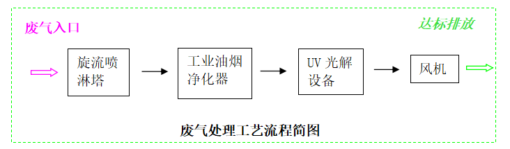 通過集氣罩對每個工位產生廢氣進行點對點收集,收集后的廢氣經過旋流噴淋塔去除部分有機物和顆粒物到工業油煙凈化器去除水霧油霧后進入光催化氧化設備(內含一個單元的活性炭纖維(活性炭)進行深度催化氧化)進行處理,處理最終潔凈的氣體由15米高煙囪排入到大氣中。旋流噴淋塔使用循環水中投加堿液可提高除硫和除氮氧化物的效果。