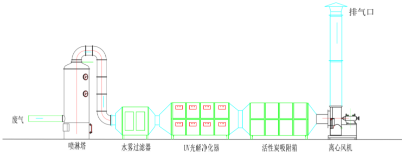 4、由采集系統將惡臭味氣體進入光量子凈化設備,在此運用特制激發光源產生的光量子引發一連串反映后,將惡臭味物質分解轉變成為CO2、H2O等無害成份,該裝置已是一種功能較強的綠色環保型空氣凈化裝置。無二次污染,反應后廢氣排出主要有氮氣、氧氣、水、二氧化碳等無害氣體。
