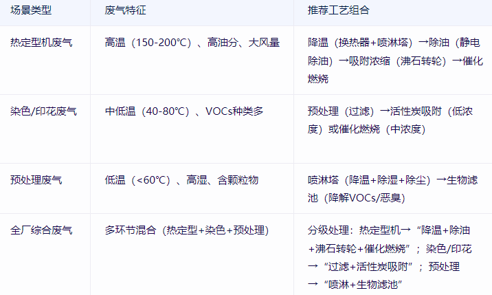 印染企業需根據廢氣來源、濃度、風量匹配工藝,典型場景如下: